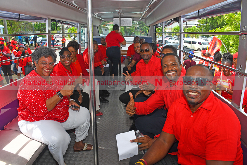 Prime Minister Mia Amor Mottley (left) and some of the Barbados Labour Party candidates, arrive on the bus to pay election deposits. (Picture by Sandy Lane)